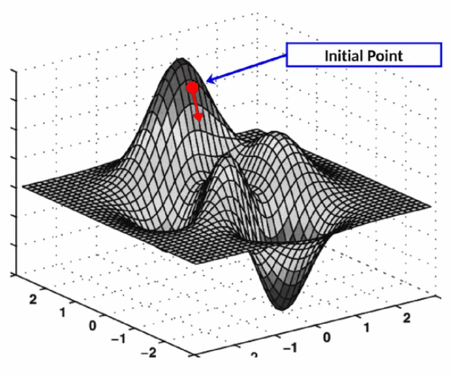 完成了第一轮计算,接下来就是进行第一轮训练,进行 BP 的传播算法。此时在推导计算过程,就需要用到偏导的知识了。其中包括了偏导的链式计算和对函数求导的知识。借用从 https://www.cnblogs.com/awei040519/articles/18529084 博客的一张图来说明偏导在这里的意义。在这里的意义就是假定输入到输出中间经过的神经网络的某些权重变量计算之后,能够获取预期的输出内容,求解神经网络中的权重变量的值。这个求解过程有解,即是求让损失函数快速到达一个极小点。在偏导意义里面,极大和极小这些极值是相同的,从极大到极小的转换只需乘以负一即可