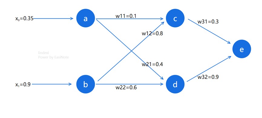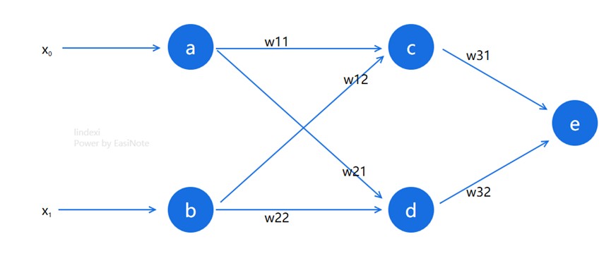 其中 a 和 b 两个点负责输入,e点负责输出。各个点之间的连接存在权重,其示意图如下,下图的 wxx 表示的就是各个边的权重。写成 wxx 的形式其实就是在隐含矩阵的概念了,只是咱本文这里不需要请出矩阵而已,如果真套上矩阵的话,这里的权重就是 w行列的表示法,即 w21 就是表示第2行第1列的值。这也是一个习惯表示方法