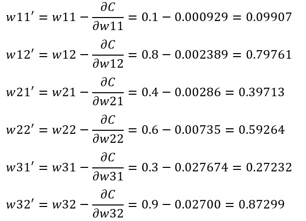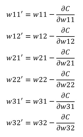 求出来各个权重对应偏导数值之后,就可以更新各个权重的值,进行下一轮计算。下一轮计算结果输出之后,再经过损失函数判断是否结果已经接近了。如果不接近,则再次求各个权重对应偏导数值,用各个权重对应偏导数值更新各个权重的值,再进行下一轮计算。这样的过程就是简化后的 BP 神经网络训练的过程。其计算方式如下,以下列举的公式中带“’”的部分表示更新之后的权重的值