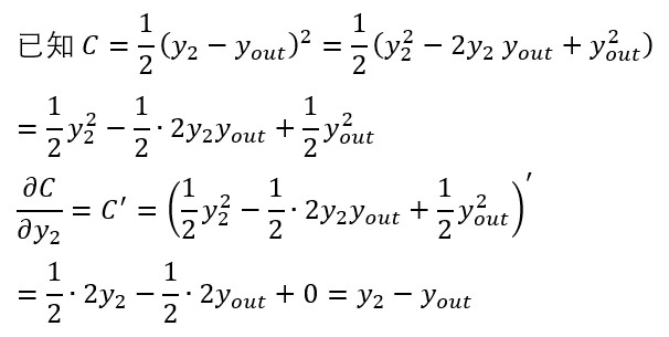 损失函数要能反馈结果和预期的距离,且还要能够求导有意义。一听到反馈结果和预期的距离,大家可能想到的就是直接减就可以了,如这样的一个函数$C=y_2-y_{out}$,但在后续步骤里一求导就约分没了,算出来的$C^{‘}=1$,自然就无法继续进行下去了。那求差的平方呢,如$C=(y_2-y_{out})^2$呢?这个就好多了,加上平方也不用去烦恼绝对值的问题了,那自然就求结果和预期的差的平方好了。试试看求导的结果 $C^{‘}=2y_2-2y_{out}$,这一求导发现约分出了2的值,那索性继续乘以二分之一好了,这样求导返回结果刚好就是简单的减法,计算机看了非常开森。于是决定出来的损失函数定义如下