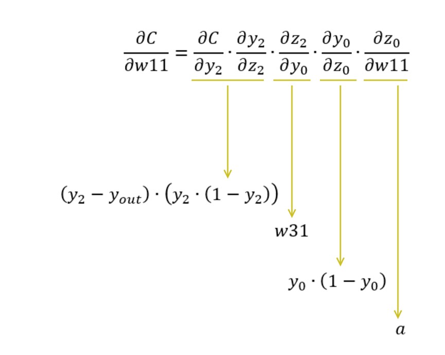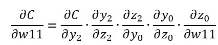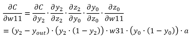 var dc_dw11 = (y2 - y_out) * (y2 * (1 - y2)) * w31 * (y0 * (1 - y0)) * a;