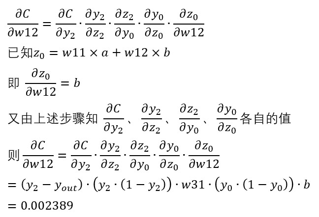 var dc_dw12 = (y2 - y_out) * (y2 * (1 - y2)) * w31 * (y0 * (1 - y0)) * b;