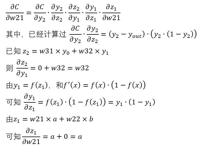 这个过程里面,各个步骤都是一个简单的确定的函数,求偏导过程也就很简单了。不需要说整个一路将 w31带入到最终计算式里面。大家如果好奇真的一路将w31带入表达式里面,最终损失函数C有多长,且求导稍微困难。通过链式的方式可以进行一级级的计算,整体复杂度也能够降低