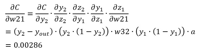 var dc_dw21 = (y2 - y_out) * (y2 * (1 - y2)) * w32 * (y1 * (1 - y1)) * a;