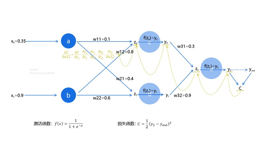 为了更加方便大家理解,这里先给各个权重添加随机的初始值。初始值很多时候真的是随机给的,依靠的是训练过程中不断算法修改参数,从而训练出一个可用的神经网络。咱现在这个神经网络只是期望训练出当拿到 x0=0.35 x1=0.9 的输入时,能够返回 $y_{out}=0.5$ 的输出。标记了添加了随机权重初始值的示意图如下