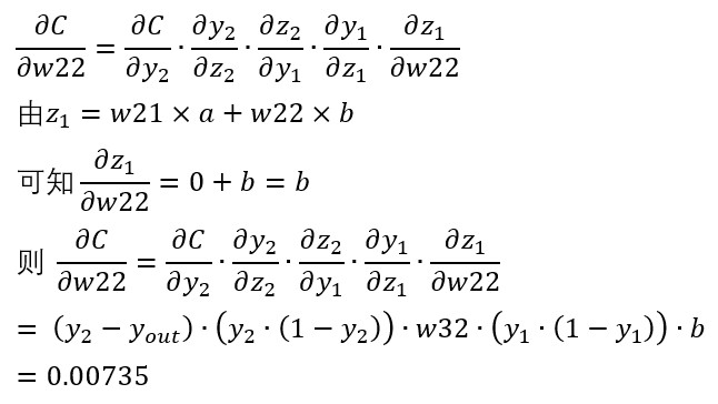var dc_dw22 = (y2 - y_out) * (y2 * (1 - y2)) * w32 * (y1 * (1 - y1)) * b;