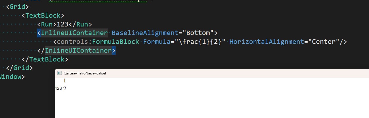 <controls:FormulaBlock Formula="\frac{1}{2}"/>